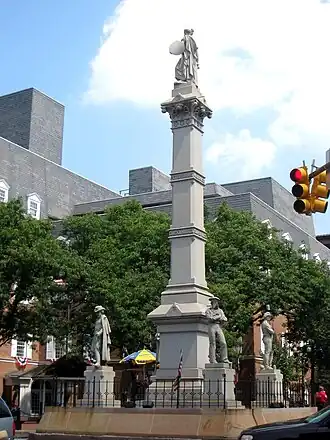 During the American Revolution, Lancaster served for one day as the temporary capital of the United States, seated at the Court House (built 1739, destroyed by fire in 1784 and rebuilt before relocating to current Lancaster County Courthouse in 1852; original site is now the Soldiers & Sailors Monument at Penn Square c. 1874),[10] on September 27, 1777, after the Continental Congress fled Philadelphia, which had been captured by the British. The revolutionary government then moved still farther away to York, Pennsylvania.[11]