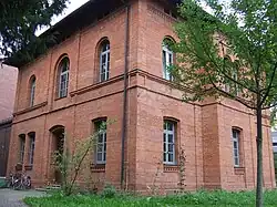 In 1854, a terminal station was constructed near the Kleinen Isar (little Isar) river. To protect the station against flooding, numerous earthworks had to be constructed. In 1857, construction started on the station building, which is now a listed building. It was built of brick and designed by the architect Simon Pausinger. A platform area was established only shortly before the opening of the station in April 1858, .