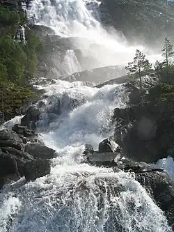 Langfossen is a waterfall located in Etne Municipality in Vestland county, Norway. The waterfall is located about 5 kilometres (3.1 mi) southwest of the village of Fjæra. The water falls down a towering mountain, a total distance of about 612 metres (2,008 ft) before the water leaps out into Åkrafjorden at the base of the mountain. European route E134 runs along the base of the waterfall, making access very easy.