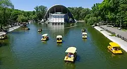 Playgrounds, a racing center, a children's train, and various areas for strolling and leisure are all present. In the middle of the park, an artificial lake has been built. A scene shaped like a seashell is decorated in one of the park's ends. There's a summer theater and several activities around the lake.[12] Swans and ducks may be seen on the lake, and during the warm season, catamarans can be ridden on it.[3] Other places of interest within the park includes:[7]