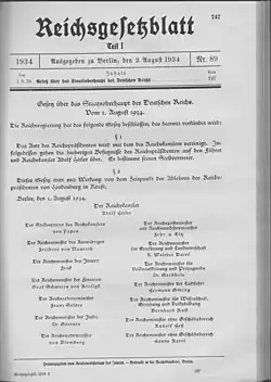 The Law Concerning the Head of State of the German Reich (German: Gesetz über das Staatsoberhaupt des Deutschen Reichs) was a statute enacted by the government of Nazi Germany on 1 August 1934 that consolidated the positions of Reich President and Reich Chancellor in the person of Adolf Hitler.