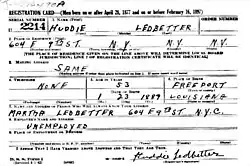 The only son of Sallie Brown and Wesley Ledbetter (she had an older son, and the couple adopted a daughter when Huddie was a toddler), Huddie Ledbetter was born on a plantation near Mooringsport, Louisiana.[9] On his World War II draft registration card in 1942, he gave his birthplace as "Freeport" (Shreveport), Louisiana. There is uncertainty over his precise date and year of birth. The Lead Belly Foundation gives his birth date as January 20, 1889,[3] his grave marker gives the year 1889, and his 1942 draft registration card states January 23, 1889.