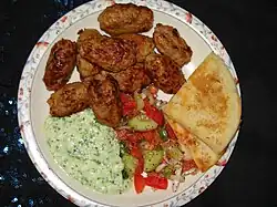 Cheese, as well as yogurt and eggs, are used in the cuisine of Lebanon. One of the more recognizable dishes within Lebanon is labneh. Unlike regular yogurt, labneh is strained so as to remove the watery whey, leaving a thicker, creamier consistency. It is spreadable and garnished with olive oil and sea salt.[48] It is an extremely versatile dish that can be served in a mezze platter for either breakfast or dinner. A variant is mixed with garlic.[48] Ejjeh is the traditional omelette of Lebanon.[49] It is made with egg, chopped parsley and scallions. Within Lebanon, people make this omelette with different herbs that are cultivated from their village.[50][51]