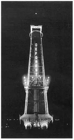 Meanwhile, White set in motion a series of highly visible promotions for American DeForest: "Wireless Auto No.1" was positioned on Wall Street to "send stock quotes" using an unmuffled spark transmitter to loudly draw the attention of potential investors, in early 1904 two stations were established at Wei-hai-Wei on the Chinese mainland and aboard the Chinese steamer SS Haimun, which allowed war correspondent Captain Lionel James of The Times of London to report on the brewing Russo-Japanese War,[12] and later that year a tower, with "DEFOREST" arrayed in lights, was erected on the grounds of the Louisiana Purchase Exposition in Saint Louis, Missouri, where the company won a gold medal for its radiotelegraph demonstrations. (Marconi withdrew from the Exposition when he learned de Forest would be there).[13]