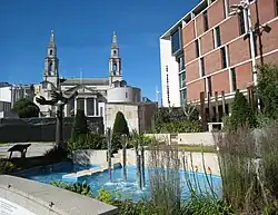 To the East of the Carriageworks Theatre are older buildings with frontages on Great George Street: the Electric Press, a former 1900 printworks in red brick with a distinctive square chimney and a Grade II listed building,[4] is now combined with adjacent properties based on a former carriageworks (hence the name of the theatre) which is also Grade II,[5] and nowadays also signed The Electric Press. These have been adapted to contain bars, restaurants, and the Film and Media school of Leeds Beckett University. The commercial use of these buildings and the inclusion of the Cuthbert Broderick helped to pay for the square.[2][6]