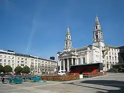 It is an L-shaped pedestrian and events area, on a South-facing slope running down from Leeds Civic Hall and bounded on the West by Calverley Street, on the other side of which is the Brotherton Wing of Leeds General Infirmary. It consists of three portions, a large open events area running East from Calverley Street; a smaller area to the East with seats and plants; and an area of seating, gardens and water features to the South. The events area is roughly rectangular and paved in York stone with granite strips dividing it into a grid, with the Civic Hall bordering about half of it. The other edge on the North is occupied by the newbuild Cuthbert Brodrick pub and restaurant (named after Leeds architect Cuthbert Brodrick). The East area with seats and plants goes up to the front of the Leeds City Museum (one of Brodrick's buildings). The South part by Calverley Street is called the Mandela Gardens, after Nelson Mandela. Beside this is the new Carriageworks Theatre, the north front of this being in white to allow use as a projection screen having a large TV screen and carrying the facilities for a stage which can be erected for events. Power and utilities, plus dressing rooms and toilets, are under the flat area for the stage. A control tower and electric substation are in a tower on the northeast of the square, by the Cuthbert Brodrick, disguised in a sculpture called "Off Kilter" by Richard Wilson which has been described as 'grenade shaped'.[1][2][3]