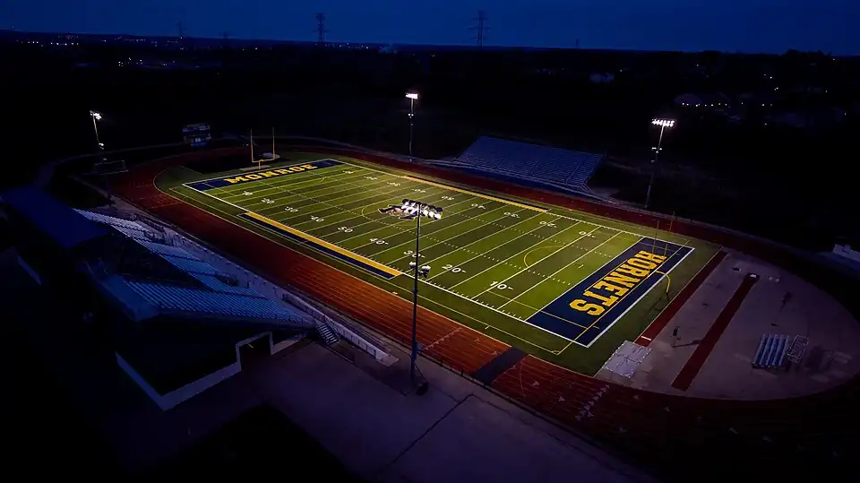 Football, soccer, and track and field all play their games at Monroe Hornet Stadium. Monroe Hornet Stadium features a turf playing surface that was resurfaced in 2019, and the track was resurfaced in 2021. Hornet Stadium has a seating capacity of 5,500.