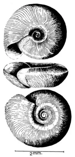 | Drawing of apical, apertural and umbilical view of the shell of Lentorbis carringtoni. | |