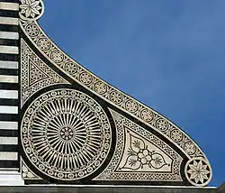 At Santa Maria Novella, Florence, between (1448–70)[19] the upper façade was constructed to the design of Alberti. It was a challenging task, as the lower level already had three doorways and six Gothic niches containing tombs and employing the polychrome marble typical of Florentine churches, such as San Miniato al Monte and the Baptistery of Florence. The design also incorporates an ocular window that was already in place. Alberti introduced Classical features around the portico and spread the polychromy over the entire façade in a manner that includes Classical proportions and elements such as pilasters, cornices, and a pediment in the Classical style, ornamented with a sunburst in tesserae, rather than sculpture. The best known feature of this typically aisled church is the manner in which Alberti has solved the problem of visually bridging the different levels of the central nave and much lower side aisles. He employed two large scrolls, which were to become a standard feature of church façades in the later Renaissance, Baroque, and Classical Revival buildings.[10]