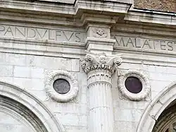 His first major architectural commission was in 1446 for the façade of the Rucellai Palace in Florence. This was followed in 1450 by a commission from Sigismondo Malatesta to transform the Gothic church of San Francesco in Rimini into a memorial chapel, the Tempio Malatestiano.[8] In Florence, he designed the upper parts of the façade for the Dominican church of Santa Maria Novella, famously bridging the nave and lower aisles with two ornately inlaid scrolls, solving a visual problem and setting a precedent to be followed by architects of churches for four hundred years.[10] In 1452, he completed De re aedificatoria, a treatise on architecture, using as its basis the work of Vitruvius and influenced by the ancient roman buildings. The work was not published until 1485. It was followed in 1464 by his less influential work, De statua, in which he examines sculpture.[8] Alberti's only known sculpture is a self-portrait medallion, sometimes attributed to Pisanello.