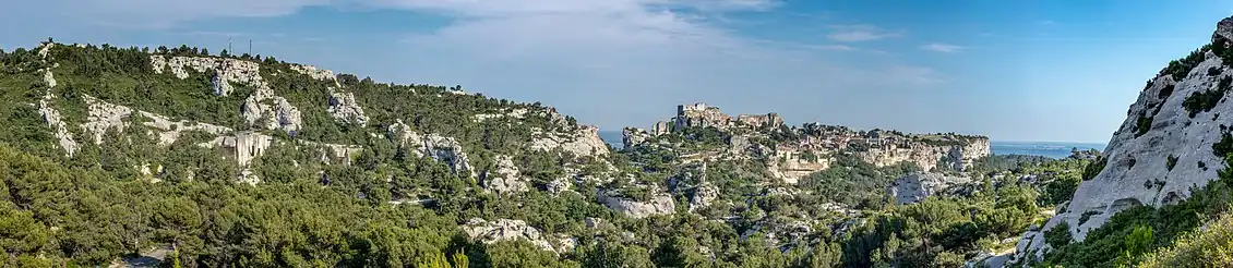 It is located in the Alpilles mountains, northeast of Arles, atop a rocky outcrop that is crowned with a ruined castle overlooking the plains to the south. Its name refers to its site: in Provençal, bauç is a rocky spur. From the village name the word bauxite was coined for aluminium ore when first discovered there by geologist Pierre Berthier in 1821. Until 13 August 1958, the commune was officially named Les Baux.[4]
