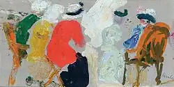 In Scotland, Alexander Reid was acting as his agent, remaining in constant contact with him throughout the First World War.[19] In March 1916, Hunter held his second one-man exhibition with Reid in Glasgow.[20] Hunter's work at this stage of his career focused primarily on still lifes, inspired by Chardin, Kalf and Manet.[9] During the 1920s, Hunter began to be associated with a group of three other artists: John Duncan Fergusson, F. C. B. Cadell, and Samuel Peploe. The four of them became known as the Scottish Colourists, although the term was not used until 1948, by which time only Fergusson was still alive.[5]