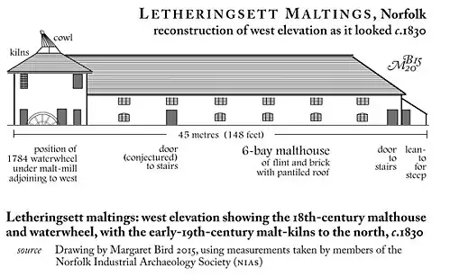 Reconstruction of the Letheringsett malthouse and kilns from the west in their working days, showing the waterwheel (left) in position under the malt-mill