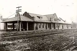 Barrett eventually sold her landholdings near the tracks and Northern Pacific constructed a wood, "regulation depot" in 1890 in a pork processing warehouse. The structure was owned by West and fellow prominent Chehalin,[c] John Dobson of John Dobson Park. A grain warehouse was built later, using funds gathered from company stock offered at $10 per share.[15][13][14] Difficulties over the right-of-way remained into August 1890 as the railroad required several hundred feet of access on both sides of the tracks. Parcels were owned by numerous other people, which included large homes that needed to be moved. Estimates to complete the acquisitions reached as high as $25,000.[19] Union Pacific built an extension of their line to the new station beginning in 1891.[20]