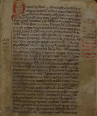 Later manuscripts do, however, use the terms chronicon or cronicon and their variants chronica or cronica.[3] The earliest is manuscript P, which contains the title De captione Jerusalem ("On the Capture of Jerusalem") added to the margin by a late medieval hand. The same manuscript also contains the more conventional title Cronica de Terra Sancta ("Chronicle of the Holy Land") added by a modern hand.[4] In the 16th or 17th century, somebody added the title Chronicon Terrae Sanctae expugnatae a Saladino ("Chronicle of the Holy Land Captured by Saladin") to manuscript V, which was copied also in V2.[5][6] V3, on the other hand, entitles it Chronica de Captione Jerusalem a Sarracenis ("Chronicle of the Capture of Jerusalem by the Saracens").[7] In the 17th or 18th century, the title Cronicon Terrę Sanctę ("Chronicle of the Holy Land") was added to manuscript A, probably by Bishop Thomas Tanner.[8]