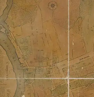 ![]() Excerpt of 1841 map of Flushing showing "Linnaean Botanic Garden and Nursery" lying north of Bridge Street (today's Northern Boulevard) | |