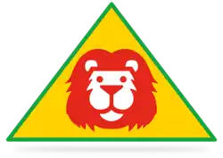 It represents a red and white lion face in a triangle with a yellow background and green borders.[1]