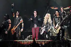 Alice Cooper is an American shock rock singer who started his career under his birth name, Vincent Furnier in the band Alice Cooper. Following the band’s breakup in 1974,[1] Furnier, legally took the name and started recording and touring with new musicians. His debut album, Welcome to My Nightmare, included, guitarists Dick Wagner and Steve Hunter, bassist Prakash John, drummer Pentti "Whitey" Glan and keyboardists Bob Ezrin and Jozef Chirowski, these musicians, except Ezrin, contributed to his debut solo tour of the same name.[2] His current tour band includes guitarist Ryan Roxie (who first joined in 1996), bassist Chuck Garric (since 2002), drummer Glen Sobel (since 2011) and guitarists Tommy Henriksen (since 2011) and Nita Strauss (who first joined in 2014).[3]