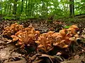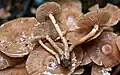 Armillaria is a genus of fungi commonly known as honey mushrooms. First treated by Elias Magnus Fries in 1821, and later assigned generic rank by Friedrich Staude in 1857,[1] Armillaria is classified in the family Physalacriaceae of the Agaricales, the gilled mushrooms.[2] The majority of species in Armillaria are saprotrophic and live mainly on dead wood, but some are parasites that can cause root and butt rot in over 600 species of woody plants.[3] Some Armillaria species form mycorrhizae with orchids;[4] others, such as A. gallica, A. mellea, and A. tabescens, are bioluminescent.[5]