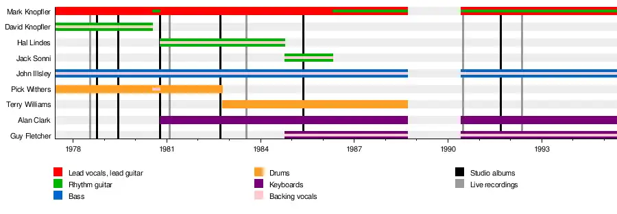 Dire Straits was formed in June 1977 by Mark and David Knopfler, John Illsley and Pick Withers.[1][2] The band released their first two studio albums, Dire Straits and Communiqué, in 1978 and 1979, respectively.[2] David Knopfler left the group during the recording of their third album Making Movies in July 1980,[3] following an argument with Mark which prompted him to return to the UK and start a solo career.[4] After the album, which featured Roy Bittan on keyboards, was released in October 1980, Hal Lindes was announced as Knopfler's replacement, while keyboardist Alan Clark was also added.[5] Withers remained until shortly after the completion of the band's fourth album Love over Gold (released in September 1982) at which point he left and was replaced by former Rockpile drummer Terry Williams.[2][6]