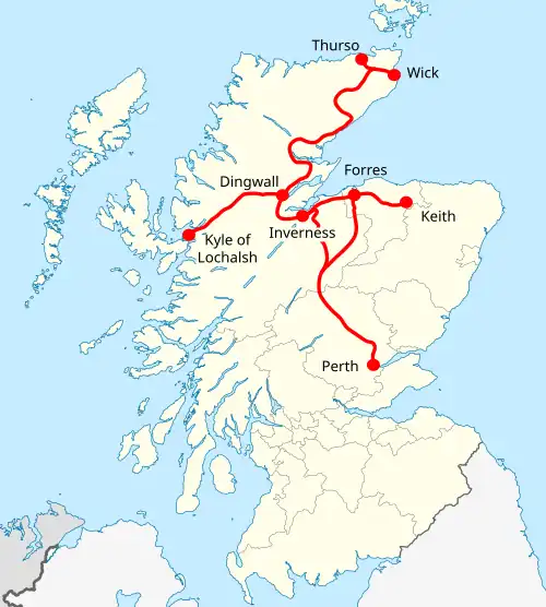 Station Distance from Perth Opened Closed Notes Inverness 117 mi 34 chains (189.0 km) 5 November 1855 Bunchrew 121 mi 34 chains (195.4 km) 11 June 1862 13 June 1960 Lentran 123 mi 45 chains (198.9 km) 11 June 1862 13 June 1960 Reopened briefly during March 1982 Clunes 124 mi 29 chains (200.1 km) 1864 Beauly 127 mi 67 chains (205.7 km) 11 June 1862 13 June 1960 Reopened 2002 Muir of Ord 130 mi 61 chains (210.4 km) 11 June 1862 Junction for the Black Isle Branch . Closed 1960–76. Conon 133 mi 78 chains (215.6 km) 11 June 1862 13 June 1960 Reopened 2013 as Conon Bridge Dingwall 136 mi 34 chains (219.6 km) 11 June 1862 Junction for Kyle of Lochalsh Line Foulis 140 mi 51 chains (226.3 km) 23 May 1863 13 June 1960 Opened as Fowlis, renamed 1916 Evanton 142 mi 58 chains (229.7 km) 23 May 1863 13 June 1960 Opened as Novar, renamed 1937 Alness 146 mi 25 chains (235.5 km) 23 May 1863 Closed 1960–73 Invergordon 149 mi 12 chains (240.0 km) 23 May 1863 Delny 152 mi 53 chains (245.7 km) 1 June 1864 13 June 1960 Kildary 154 mi 35 chains (248.5 km) 1 June 1864 13 June 1960 Opened as Parkhill, renamed May 1868 Nigg 156 mi 79 chains (252.6 km) 1 June 1864 13 June 1960 Fearn 158 mi 34 chains (255.0 km) 1 June 1864 Tain 162 mi 0 chains (260.7 km) 1 June 1864 Edderton 167 mi 29 chains (269.3 km) 1 October 1864 13 June 1960 West Fearn Platform[ a] 172 mi 78 chains (278.4 km) 1926 1928 Briefly open as Mid Fearn Halt in 1864/5 Ardgay 175 mi 43 chains (282.5 km) 1 October 1864 Bonar Bridge until May 1977 Culrain 178 mi 51 chains (287.5 km) 1871 Invershin 179 mi 7 chains (288.2 km) 13 April 1868 Lairg 184 mi 49 chains (297.1 km) 13 April 1868 Rogart 194 mi 47 chains (313.2 km) 13 April 1868 Closed 1960/1 The Mound 198 mi 44 chains (319.5 km) 13 April 1868 13 June 1960 Junction for the Dornoch Light Railway . Golspie 202 mi 6 chains (325.2 km) 13 April 1868 Dunrobin 203 mi 72 chains (328.1 km) 1 November 1870 Private after 1871, closed 1965. Reopened for irregular services after 1985 Brora 208 mi 15 chains (335.0 km) 19 June 1871 Loth 213 mi 39 chains (343.6 km) 19 June 1871 13 June 1960 Helmsdale 219 mi 10 chains (352.6 km) 19 June 1871 Salzcraggie Platform 221 mi 70 chains (357.1 km) 28 July 1874 29 November 1965 Restricted use after 1907 Kildonan 228 mi 52 chains (368.0 km) 28 July 1874 Borrobol 232 mi 42 chains (374.2 km) 1878 29 November 1965 Known as Borrobol Platform until 1962 Kinbrace 235 mi 71 chains (379.6 km) 28 July 1874 Forsinard 243 mi 34 chains (391.8 km) 28 July 1874 Altnabreac 251 mi 56 chains (405.1 km) 28 July 1874 Scotscalder 260 mi 61 chains (419.7 km) 28 July 1874 Halkirk 263 mi 39 chains (424.0 km) 28 July 1874 Georgemas Junction 264 mi 79 chains (426.5 km) 28 July 1874 Junction for Thurso Bower 267 mi 59 chains (430.9 km) 28 July 1874 13 June 1960 Watten 271 mi 50 chains (437.1 km) 28 July 1874 13 June 1960 Bilbster 275 mi 7 chains (442.7 km) 28 July 1874 13 June 1960 Wick 279 mi 14 chains (449.3 km) 28 July 1874