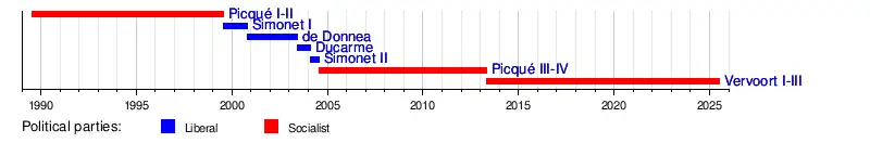 | 6 | | Charles Picqué (1948– ) | 19 July 2004 | 7 May 2013 | 8 years, 291 days | PS | Picqué III | VLD, sp.a, CD&V | PS, cdH, Ecolo |