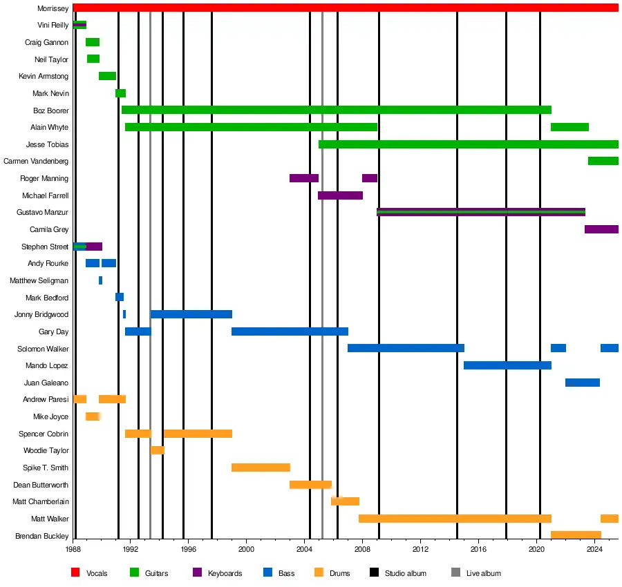 | Morrissey | 1988–present | lead vocals | all releases | |
