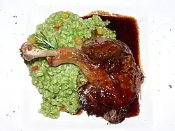 - Arroz con pato a la Limeña: Like Arroz con pato a la Chiclayana but the salad contains mashed avocado, carrot, mayonnaise, and other ingredients.