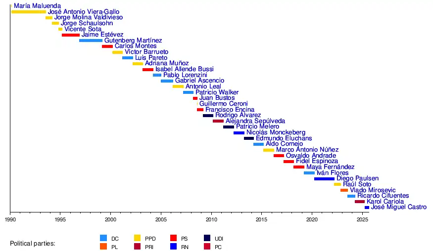 | 2 | | José Antonio Viera-Gallo (born 1943) | 11 March 1990 | 21 July 1993 | Party for Democracy | |