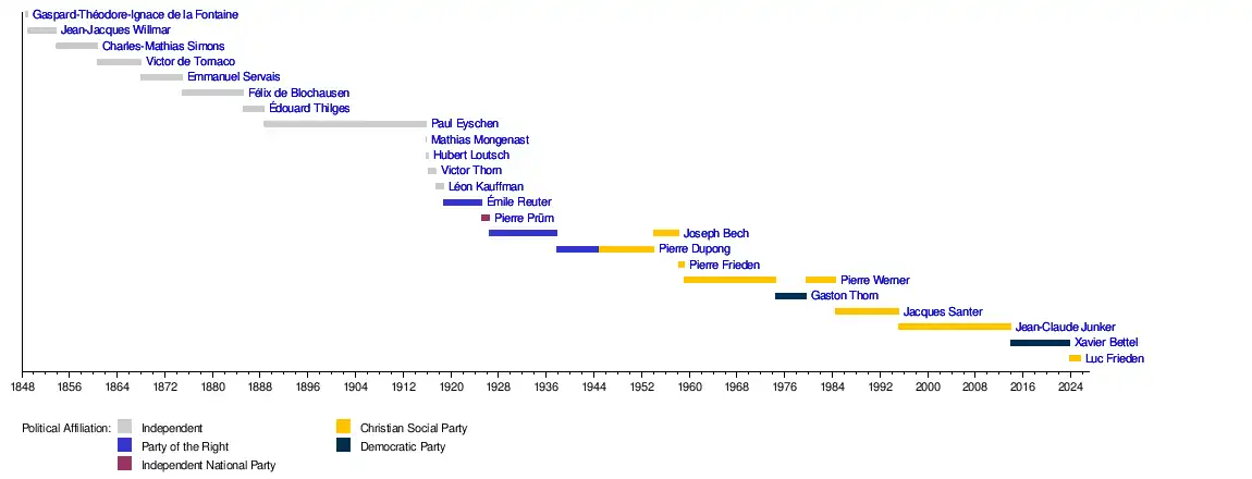 | 25 | Luc Frieden (born 1963) | | CSV | 2023 | 17 November 2023 | Incumbent | Frieden-Bettel | CSV, DP | ||