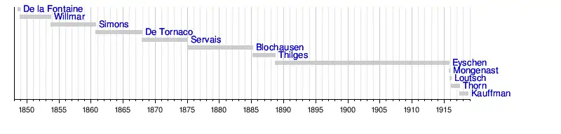 | 5 | Lambert Joseph Emmanuel Servais (1811–1890) | | 1 2 3 4 5 | 3 December 1867 30 September 1869 12 October 1869 7 February 1870 25 May 1873 | 30 September 1869 12 October 1869 7 February 1870 25 May 1873 26 December 1874 | ||