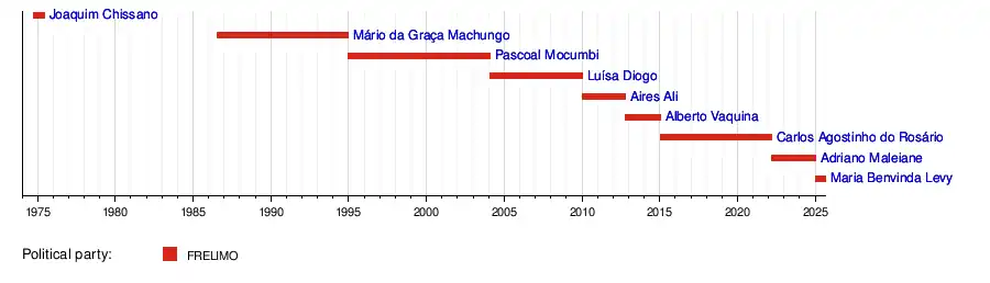 | 8 | Maria Benvinda Levy (born 1969) | 15 January 2025 | Incumbent | 215 days | FRELIMO | 2024 | |