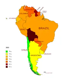 Estimation of the World Bank Group for 2023.[2][3][4] The data is filtered according to the list of countries in South America. The values in the World Bank Group tables are rounded. All calculations are based on raw data, so due to the nuances of rounding, in some places illusory inconsistencies of indicators arose, with a size of 0.01 year.