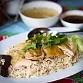 | Khao man gai | ข้าวมันไก่ | Chicken rice | | Rice steamed with garlic served with sliced chicken, chicken broth, and a spicy dipping sauce. This is a Thai version of a dish called Wenchang chicken (文昌雞) from Hainan in southern China. | |