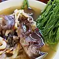 | Bami haeng pet | บะหมี่แห้งเป็ด | Egg noodles served "dry" with duck | | Egg noodles served "dry" with slices of braised duck, and often, as shown on the image, together with "blood tofu". The broth is served on the side. It is originally a Chinese dish. | |