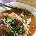 | Khao soi Mae Sai | ข้าวซอยแม่สาย | North | Khao soi Mae Sai is the name in Chiang Mai of a certain type of khao soi that is more common in Chiang Rai province, in the area along the border with Burma and Laos (Mae Sai is a border town in Chiang Rai province). It is a spicy soup-like dish, similar to the broth used in khanom chin nam ngiao, containing soft, wide rice noodles, pork ribs, congealed pork blood, and minced pork. Tomatoes and fermented soy bean give it its specific taste. Sliced raw cabbage and bean sprouts are served on the side. | ||