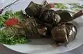 | Khao tom mat | ข้าวต้มมัด | | The dish is made by wrapping sweet banana and sticky rice inside a banana leaf and then steaming it. The banana takes on a pink color after steaming. | ||