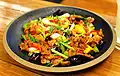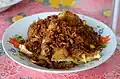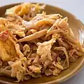 | Phat mi Khorat | ผัดหมี่โคราช | Nakhon Ratchasima Province | A stir-fried rice noodle dish commonly served with papaya salad (som tam). Dried rice noodle (of many colors) is a specific ingredient; made with dried rice noodle, garlic, shallot, pork, salt soya, beans, fish sauce, palm sugar, red pepper, black soy sauce, water, spring onion and bean sprouts. Traditionally used to exploit preserved old rice; used in religious ceremonies. | ||