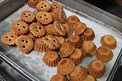| Khanom farang kudi chin | ขนมฝรั่งกุฎีจีน | "Foreigner's snack of the Chinese church" | | Bangkok | Small muffins. The main ingredients are duck eggs, sugar and wheat flour. No butter, milk or yeast. No preservatives. The little cakes are topped with raisins, gourds dipped in syrup, and persimmon.[6] |