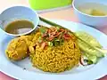 | Khao mok gai | ข้าวหมกไก่ | Thai chicken biryani | The Thai version of a "chicken biryani". The name literally means "rice covered chicken" and this Thai-Muslim dish is made by cooking rice together with the chicken curry. | ||