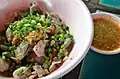 | Mu ruam luak chim | หมูรวมลวกจิ้ม | This dish consist of several types of pork (intestines, liver, and other cuts) which have been shortly blanched in boiling water or stock and then served with fried garlic, spring onions and a spicy dipping sauce. | |||