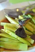 | Khanom kuichai | ขนมกุยช่าย | Fried chive dumplings | | Originally a dish of the Teochew people called "gu chai gue" (Chinese script: 韭菜馃) in the Teochew language, these are steamed dumplings made from rice powder and a filling of garlic chives. The dipping sauce for this dish is soy sauce which often is spiced with dried chili flakes. This particular version was fried to give it a crispy texture. | |