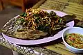 | Pla sam thap | ปลาสามทัพ | | Fish prepared in 3 different ways: on the left of the image is pla sam rot (deep-fried served with a tangy sweet chili sauce), in the middle pla nueng manao (steamed fish with a raw garlic, lime and chili sauce), and on the right pla thot krathiam (deep-fried fish with deep-fried garlic). | ||