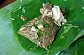 | Khanom tom | ขนมต้ม | South | A Southern Thai snack made from sticky rice, coconut milk, sugar, and salt. The mixture is wrapped in a young mangrove fan palm leaf, formed into a triangle shape, and then boiled or steamed until cooked. Eaten during the Chak Phra Festival. | ||