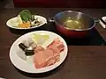 | Mu kratha | หมูกระทะ | | Mu kratha resembles a combination of a Korean barbecue and a Chinese hot pot. Meat (most often pork) is grilled in the center while the vegetables and other ingredients, such as fish balls, cook in the soup. It is served with a variety of nam chim (Thai dipping sauces). | ||