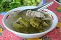 | Khanom chin kaeng khiao wan kai | ขนมจีนแกงเขียวหวานไก่ | | This noodle dish consists of green chicken curry served over khanom chin, fresh Thai rice noodles. It is usually accompanied by a selection of raw vegetables and herbs on the side. The chicken meat used in this particular version is chicken feet. | ||