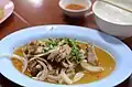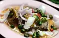 | Kuaichap | กวยจั๊บ | Originally a Teochew Chinese dish (Chinese: 粿汁), it is a soup of pork broth with rolled up rice noodle sheets (resulting in rolls about the size of Italian penne), pork intestines, "blood tofu", and boiled egg. | |||