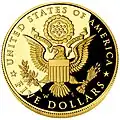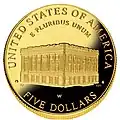 | $5 | U.S. Capitol Visitor Center half eagle | Corinthian column | Image of the original Capitol building | Au 90%, Ag 6%, Cu 4% | Authorized: 100,000 (max) Uncirculated: 6,761 W Proof: 27,652 W | 2001 | | |