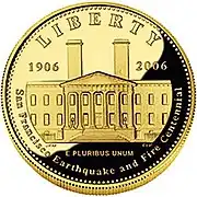 | $5 | San Francisco Old Mint half eagle | A rendition of the Old Mint modeled after the original construction drawing by architect Alfred B. Mullett | A replica of the 1906 Coronet Half-Eagle reverse | Au 90%, Ag 6%, Cu 4% | Authorized: 100,000 (max) Uncirculating: 16,230 S Proof: 41,517 S | 2006 | |