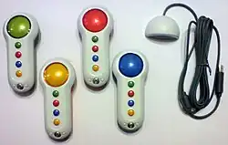 The games Scene It? Lights, Camera, Action and Scene It? Box Office Smash come bundled with 4 special wireless controllers called Big Button Pads, which work similarly to the Buzz! buzzer controllers. Each controller has one large "buzzer" button at the top and four smaller buttons for answering multiple-choice questions. The large buzzer button also functions as a four-way directional pad, which helps to navigate the Xbox 360 dashboard menu. The games' prices are unaffected by the inclusion of the controllers. Other games such as Uno, 1 vs. 100, Wits and Wagers, and You Don't Know Jack[23] have added support for the Big Button Pads.